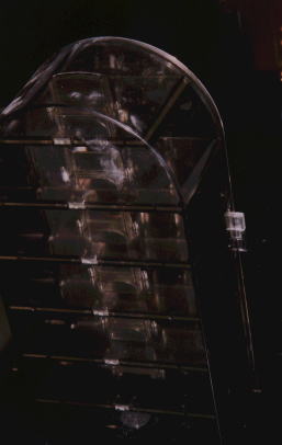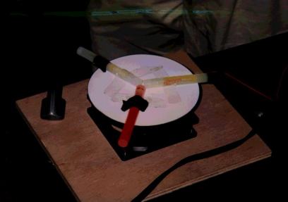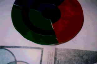 | 光の3原色-その2 (前田さん) 100円ショップで、赤、青、緑のライトステップを購入。(化学発光するものです。)3色を回転円盤につけ、円盤をモーターでまわします。 テープを貼った部分は、その色が抜けた混色になります。 |