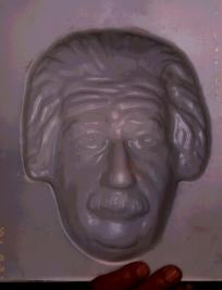 | 凹凸の不思議 (戸田さん) 2つのアインシュタインの像ですが、片方は凸面(すなわち、でっぱっている)、他方は凹面(すなわち、ひっこんでいる)なのですが、どちらが凸面かわかりますか。写真にしてもよくわからないですね。実物でも区別がつきません。私たちが見ているものは、実物そのまま見ているのではなく、脳で情報処理された像をみているのだということがよくわかります。 |