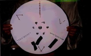 | 光の3原色-その1 (川田さん) 赤、青、緑の超高輝度ダイオードを各10個ずつ円盤につけ、円盤をドリルで回転させて、混色を調べます |