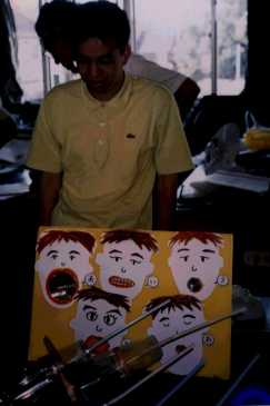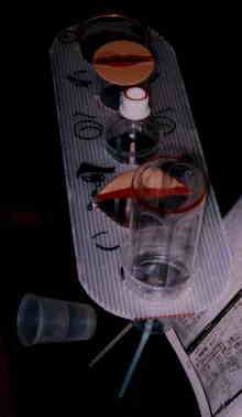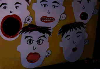 | しゃべるコップ (戸田さん) 広島の土肥さんからのプレゼント 口の形をまねたコップにストローをつけ、ストローをこすると、まるで人が発音しているように、アイウエオが聞こえます。口の形が母音の発音をするのに重要な役目を果たしていることがわかります。 |