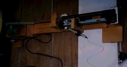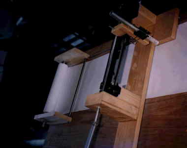| 単振動記録機 (前田さん) 円運動→直線運動→サインペン で描く図形。紙はモーターで巻き取ります。 いつもながらの大掛かりな装置をつくる力量に敬服。 |