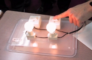 | ダイオードの問題 (清水さん) 前にも紹介されました、ダイオードを使ったマジック。直列につないであるようにみえるので、スイッチを切ると2つの電球は消えそうに思えますが、じつはダイオードを入れてあるので、片方の電球しか消えません。 2000年7月16日の例会の電球の不思議も見てください。 |