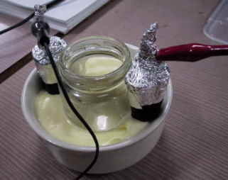 | 電気パン−更なる工夫 (飯田さん) 金属極板を使う電気パンは、電気分解などの反応で有害イオンが生成される可能性が否定できない、ということで、金属を使わずに電気パンを作ろうという工夫です。 電極は備長炭。そのままでは中央部が焼けるが周囲がうまく焼けないので、中央部に瓶を置いて、これならどうだという装置。ここで初実験。 う〜ん。これでも均一には焼けません。もう一工夫必要なようです。 |