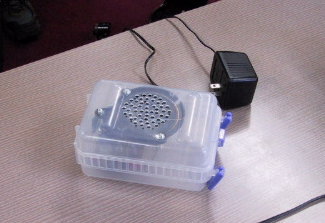 | 超音波を使った波の実験 (奥谷さん) 超音波発信機と受信機の利用方法です。左が発信機、右が受信機です。受信しながら、2台を相対運動させると、ドップラー効果による音の高さの変化を聞くことができます。ただ、聞こえるのは超音波を周波数変換して可聴音にしているのだということに留意する必要があります。 下の写真は、発信機を2つにして干渉を確認しようとしたものです。40cmぐらい離れた位置で受信機を少しずつうごかすと、位置によって音の大きさが変わります。 |