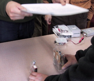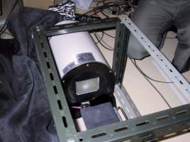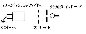 イメージインテンシファイヤーを使った光子の干渉実験 (林さん、杉本さん) 光子1個の入力を感知して、それを増幅して見られるイメージインテンシファイヤー(映像増幅装置)で、ヤングの干渉実験を、光子レベルで確認してみようという、意欲的な実験。 左がそのイメージインテンシファイヤー。右は発光ダイオードとスリットをいれた容器。実験は、装置を暗幕で覆い、部屋を暗くして行います。 |