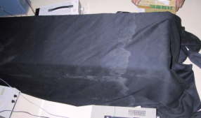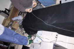 実験は暗幕で覆って行います。イメージインテンシファイヤーに余分な光子がはいらないように注意します。 |