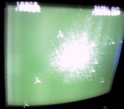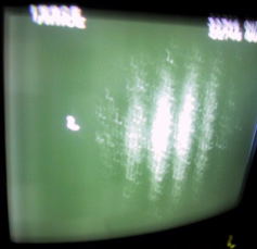 | 発光ダイオードの発光量とスリット幅を調節して、イメージインテンシファイヤーに到達する光子の量を1秒に数個から数十個に調節します。 光子が到達すると、つながれたモニター画面に点々と光子の位置が映ります。新たに到達した光子の位置を画面上に加えていくと、干渉模様がやがてあらわれてきます。 1個1個の光子の到達位置は予測できないが、多数の光子の到達位置の分布は予測可能である、という量子効果が、まさに目前で現れたわけです。 下左は単スリットの場合で、下右は複スリットの場合です。 |