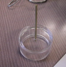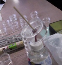 | マックスウェルのこま簡易版 (山本さん) 山本さん得意のマックスウェルのこま。今回はその簡易版です。ラウンドケースと竹串をつかって簡単につくれます。ゴルフのティーなどの上で回してやれば、歳差運動をしないこまのできあがり。針金などを軸に当ててやると、軸がその周囲を回りだします。これなら生徒実験にも使えそうです。 |