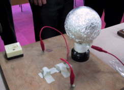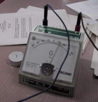 | 熱電子はガラスを通る? (林さん) 電球をアルミ箔でくるんで点灯し、そのアルミはくをアースすると、アースした線に電流が流れるという実験。電球のフィラメントから出た熱電子が、ガラスを本当に超えてくるのか?という疑問が出されたため、確認実験。 たしかにアルミ箔はアース(0V)に対して負電位になっています。電子がアルミ箔にたまり、アースに流れていくと考えるしかないようです。 |