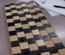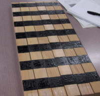 | 錯視第2弾 (山岡さん) 同位置に並べると平行に見える角材が、右の写真のように模様をずらすと、何と並行ではなく、ゆがんだように見えます。見る角度や距離のよってゆがみ方が異なりますが、頭では平行とわかっているのに目では違って見える、不思議ですね。 |