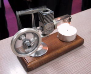 | スターリングエンジン (林さん) 林さんが知り合いから手に入れたもの。ドイツ製のスターリングエンジンです。ろうそくで暖めるだけで、勢いよく動きます。非常に早く動くので、本当に熱の移動で動いているのだろうか疑問に思えるほどです。 値段が約3万円ぐらいだとか。ちょっと高級すぎる値段ですね。ちなみに大きさは横が15cmぐらいです。 |