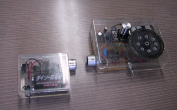 | 実験中に、伊藤さんがアドバイスをくれました。送信機と受信機を、右の写真のように上向きにして、少し上で紙などを動かしてやると、音の変化がきこえます。これは、コウモリが虫を見つける仕組みそのものです。こうもりは、この音を聞いて、虫の種類などを聞き分けているそうです。生き物ってすごい能力を持っているんですね。 | ![]() |