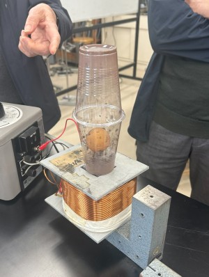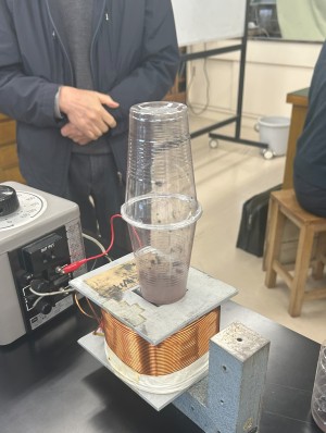 ところで、磁石片を大きくするとどうなると思いますか?掲示物を貼るための磁石を2,3個カップに入れて実験。電圧が小さいうちはカップの底で揺れているだけです。