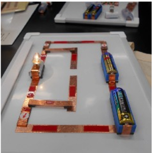| シートに銅テープがはってあり、パーツをおいてゆきます | 自分の電球をつける対戦ゲーム中 |