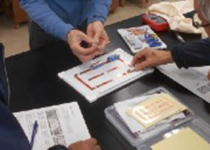 | 「回路カード」とは兵庫の森本雄一さんが開発された実験装置です。夏の科教協全国大会の森本さんのナイターに参加したときに手作りの回路カードの手軽さ、自由度に感動し、それ以来機会を見つけて紹介しています。 ここで紹介したものはクリアファイルに銅テープ(幅8mm)を写真のように貼ったもの。これを磁石がつくホワイトボードに乗せて棒磁石で固定します。銅テープ間のスペースに電球や導体などのパーツを乗せて回路を作ります。各パーツの裏には磁石がついていて磁力で固定されます。 小学校から高校までの教科書にあるほとんどの回路実験が簡単にできてしまうという優れものです。接触不良を気にしながらリード線でつないで、などという煩雑さから解放されます。 さらに、この装置の特徴である自由度は子どもたちの発想を刺激することも付け加えます。子どもたちはいろいろと試して遊びます。 「二人で一つずつパーツを乗せて、自分の電球を点灯させたら勝ち」などというゲームもできます。 | ![]() |