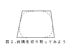 図1のドーナツ型のものを4分の1に切ってみる。さてこの1/4のものは,熱を加える前にはどのような形をしていたのだろうか。熱を加える前は,プラコップの側面の部分として台形のような形をしていたわけである。ということは,プラコップの側面を台形のように切り取れば,ドーナツ型の1/4と同じような形のものができるわけである。それでは,台形型に切り取ったものの四隅のかどを丸く切りとって(図2),それに熱を加えたらどうなるだろうか。ええっ!なんと,三日月型アクセサリーができたではないですか(図3)。
