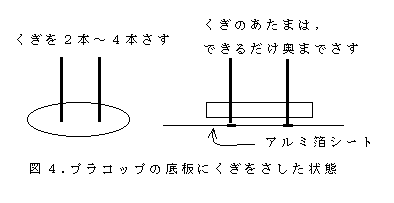 プラコップの底面だけを利用すれば,もっと小さい円盤形のものができる。それでは,この底を利用して,オリジナル・ボタンを作ってみよう。ボタンの大きさについては,自分が希望する大きさのものができるまで,何度か練習してみる必要がある。 さて,ボタン穴はどうやってあけるとうまくいくだろうか。熱処理を終えたボタンに,電気ドリルで穴をあけるのは,子ども達のための科学実験教室では怪我の心配があるのと,技術面の問題として穴をあけるときにせっかく作ったボタンが割れないともかぎらない。トースターから取り出して熱いうちに釘で穴をあけることを試みたが,釘で穴をあけるときにボタンがそってしまって,かえっていびつになった(もちろん,それを芸術的に素晴らしいと思う子どもたちもいるので,あながち否定はできないが)。それでは,どうすればいいのだろうか。 種明かしをします。熱を加える前に,ボタンの穴の位置を決めてそこに釘をさしておく(図4)。 釘をさしたまま,トースターで熱を加える。ボタンが冷えてから,釘を抜く。これで,オリジナル・ボタンの完成である(図5)。
