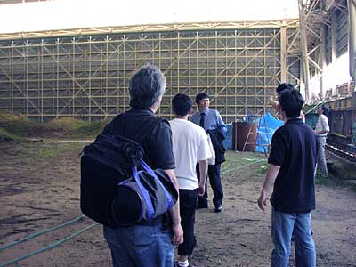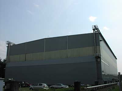 1![]() 防災研には「大型移動降雨装置」というのがあります。土砂災害の研究などに使うそうですが、この巨大な倉庫がまるごと実験棟となっているのです。しかもこの棟は移動する!? |