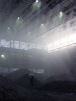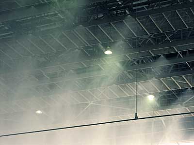 4![]() 圧巻なのは天井に張り巡らされたパイプです。どうやらここから雨が降るらしい。 |