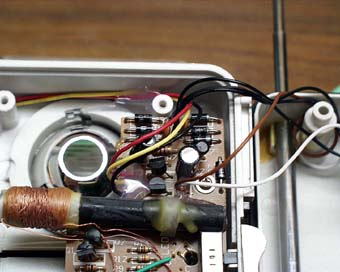 家に帰って早速裏蓋を開けてみました。一見マブチモーター風のメカから電線が3本出ています。辿ってみるとダイオードが6個。これはなんと3相交流発電機です。ハンドルを回すとメカ全体がぐるぐる回ります。ということは多分外側にマグネットがあって、内側に固定された発電コイルがあるわけです。そうすると普通はコイルを1組または2組付けて、単相交流にするのですが、なぜわざわざ3組のコイルで3相にしたのかは判りません。