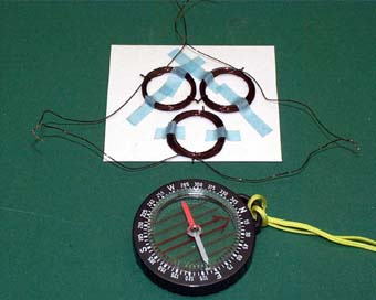 磁気コンパスにコイルを3組くっつけ、三相交流を流せばこれは同期電動機(シンクロナスモーター)になるのではないかと考え、手持ちのエナメル線で20mmφのコイルを巻いてみましたが、エナメル線が短くて3個作ろうと思うと20回しか巻けません。とりあえずそれで実験しましたが、抵抗(インピーダンス)が低すぎるのか、発電機がショート状態(ハンドルがすごく重くなるので判ります)になって失敗です。せめて100回くらいは巻かないとダメののようです。