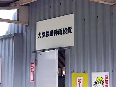 1![]() 防災研には「大型移動降雨装置」というのがあります。土砂災害の研究などに使うそうですが、この巨大な倉庫がまるごと実験棟となっているのです。しかもこの棟は移動する!? |