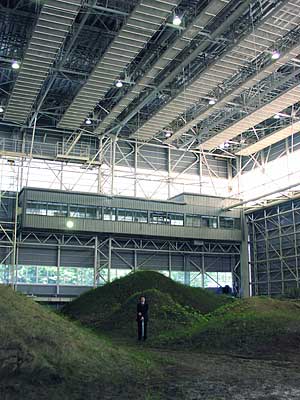 3![]() そこはとても高い天井の、がら〜んとした建物でした。中には土や砂が積まれています。 |