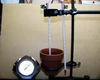 気温29.5℃、水温27℃で開始、30分後23.5℃まで下がりました。湿度は55%です。といいつつ実験装置を眺めていてハタと気がつきました。これは乾湿球温度計(湿度計)そのものではないかとね。