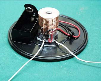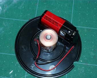 中を開けてみました。中央にコイルがあり、006Pという9Vの電池が付いています。コイルの根っこには、なにやらトランジスタのようなものが見えます。(写真4)