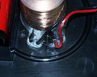 この部分を拡大すると、まさしくトランジスタです。コイルは外側に薄い色の細いエナメル線、内側が少し太い線(色も少し濃い色)です。写真では少し見えにくいと思いますが、ルーペで拡大してみると、電池のプラスが、トランジスタのコレクタ、マイナスが太い方のコイル、エミッタに両方のコイル、そしてベースに細い方のコイルがつながっています。(写真5)