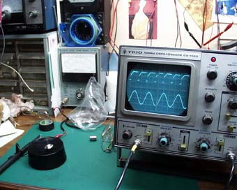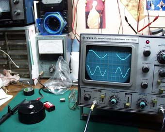 電池をつながない状態では、きれいな正弦波(サインカーブ)が見られます。上が誘導波形で、下は周波数校正用の50Hz(ヘルツ)です。(写真7)