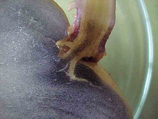 ジャガイモを芽の部分で輪切りにして,ヨウ素液をつけてみます。