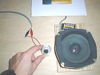 キムコの活性炭で自作したマイク(左)で、スピーカーから音が聞こえる。