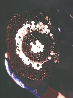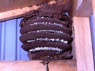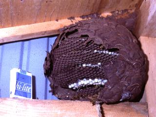 もう、十年以上も前のことになるが、庭先の物置に、スズメバチが知らぬ間に無断入居した。地上1.8mほどの高さ、こんな低いところに巣をかけたのを見たのは初めてだ。殺生は好まないが、家人が攻撃を受けるにおよんで、やむを得ず退治した。未明、ハチが飛べない時期を見はからって、巣の入口の穴に火をつけたバルサンロッドを突っ込み、毒ガス攻撃で壊滅させた後、巣の解体にかかった。