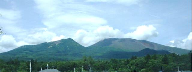 右が浅間山、左が黒斑山(外輪山)、その左に続く高峰山のむこうに池の平湿原があります。