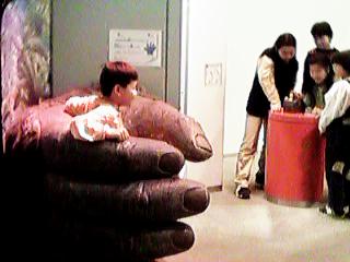 人体のしくみを説明した展示がかなりある。これも人気で行列ができていた展示の一つ。胸部X線撮影の仕立てて、あたかも自分の体内を透視しているかのようなディスプレイ。心臓の位置や動き、血液の循環などが一目瞭然。もちろんハーフミラーを使ったトリック。