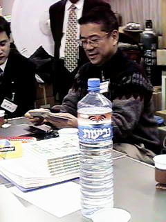 マンタさんが自ら汲んできた「死海の水」。PETボトル1本分しかない。まずは皆で「お味見」。塩辛いばかりでなく、とてもにがい。後味が口内に残る。