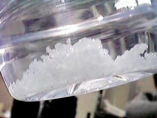 ボトルの底には析出した食塩の結晶が・・・。つまり飽和食塩水だということだ(左)。