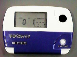 UVセンサー付きコンパクトクロック「やかないで」(リズム時計)。お肌のタイプを入力しておくと、日焼けの警告アラームが鳴るという。UVセンサーに興味がわいた。