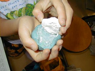 ![]() 石膏が冷えればできあがり。はさみで慎重に風船を切り開き、「卵」を取り出します。 |