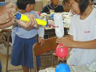![]() 子どもは握力や肺活量がないので、こんな工夫もあります。PETボトルに空気入れをとりつけて、風船をふくらませながら流し込みます。 |