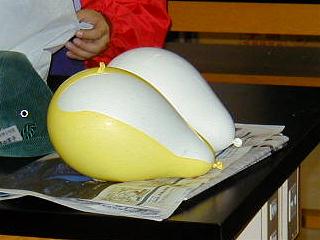 ![]() 石膏を大きめのマヨネーズチューブに入れ、口に風船をかぶせて逆さにし、風船をふくらませながら石膏を流し込みます。そのあとさらに口で少しふくらませて口をしばります。 |