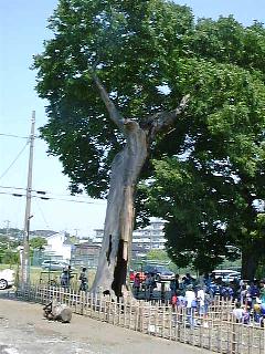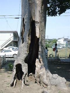 御霊神社では、境内にそびえるケヤキの大木を観察しました。太い幹の内部はすでに空洞化していますが、樹勢を保っています。樹齢は不詳です。