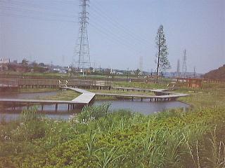 大庭大橋(後方)をくぐると、広大な大庭遊水地が広がります。自然保全ゾーン、自然触れ合い体験ゾーンの湿原は多くの野鳥のすみかです。
