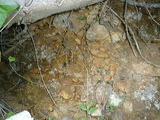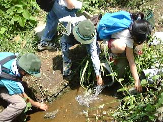 わき出る水に手を触れてみます。サワガニを捕まえるのに夢中の子供も・・・。ヒルを初めて見たという子もいました。