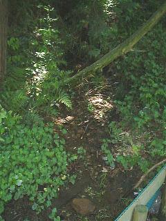 11:40ごろ。河岸段丘の段丘崖の下にある稲荷山成就院に到着。愛染明王をまつります。このあたりで相模野礫層の露頭(右)を観察することができます。下の泥層と上のローム層に挟まれて透水層となり、湧水を生みます。