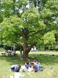すがすがしい青空の下、お弁当を食べ、木登りに興じる子供達。出題されたクイズの解答作りに余念がない一団も。