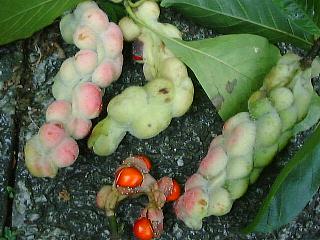 拳骨に似たコブシの実。熟れると果皮がはじけて赤い実がのぞきます。