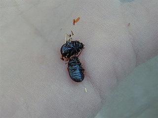 中央やや上に2匹見える、体長6ミリほどの褐色の甲虫が「ブタクサハムシ」。国内では1997年に初めて確認された北米からの侵入昆虫です。これまで天敵がなくて大繁殖してきた帰化植物のブタクサ類をものすごい勢いで食い荒らしています。
