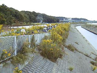 セイタカアワダチソウが一面に黄色い花を咲かせている境川土手